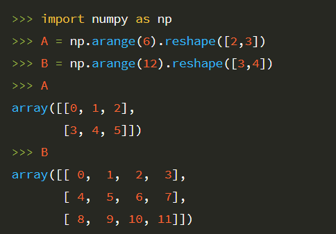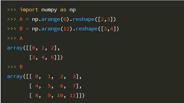 다음의 예제는 2x3 행렬과 3x4에 대한 np.dot 사용 예이다.